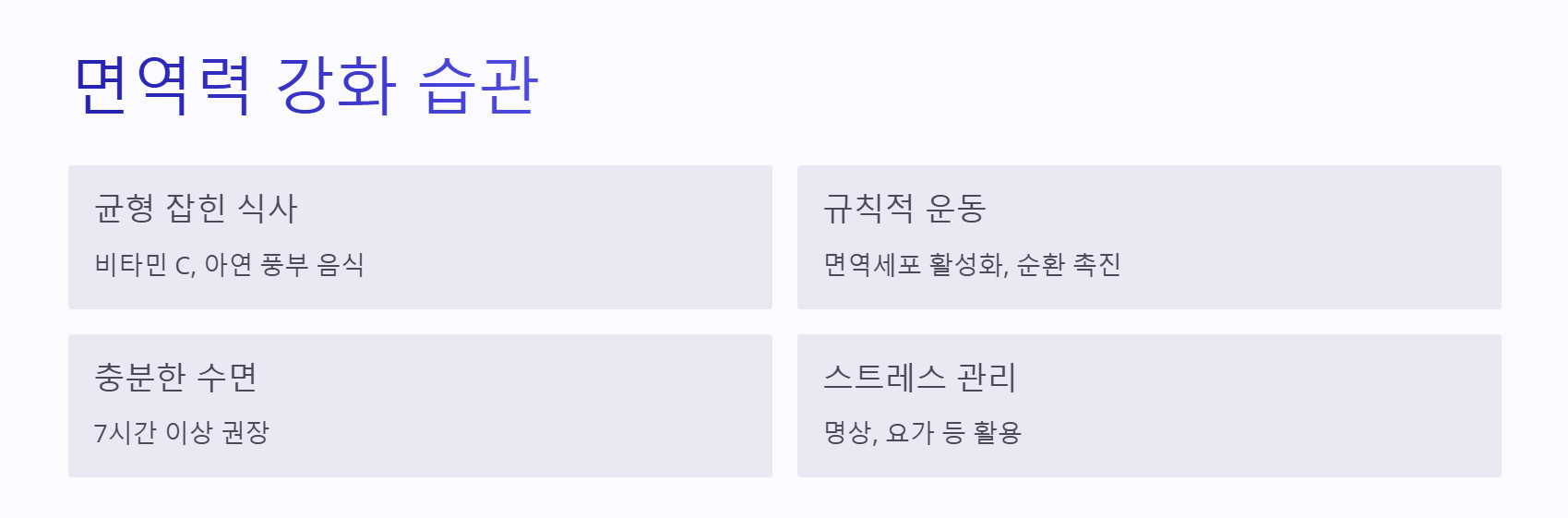 수면 부족은 면역체계를 약화시키는 주요 원인입니다. 하루 7시간 이상의 수면을 유지하세요.