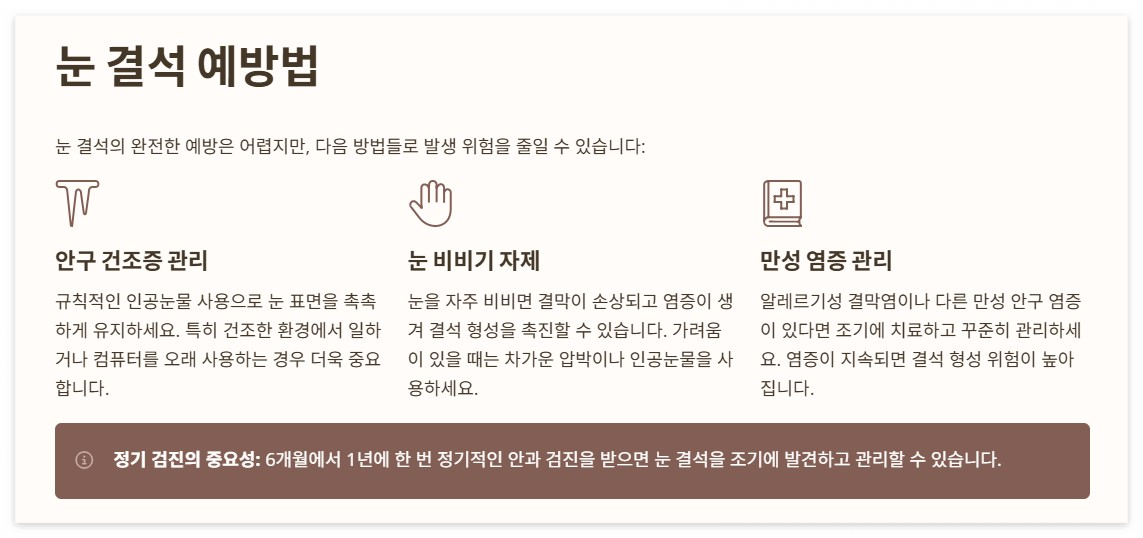 - 외상 또는 수술 후 변화: 결막이 손상되면 치유 과정에서 칼슘 등이 뭉쳐 결석이 될 수 있습니다.