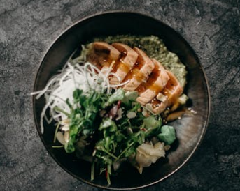 퀴노아밥 + 닭가슴살 샐러드(올리브오일 드레싱) + 구운 가지·애호박